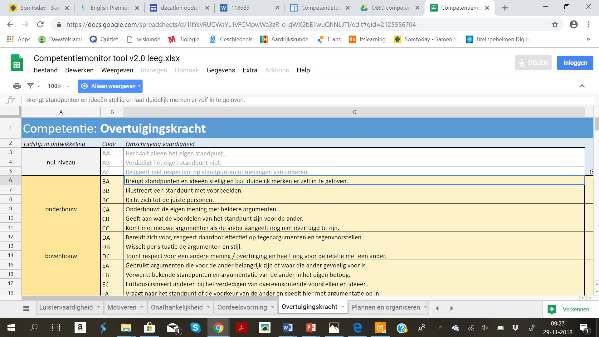 Voor elk O&O project moeten we een leerdoel hebben. Daarvoor hebben we de competentiemonitor. In de competentiemonitor staan allerlei competenties. In die competenties staan leerdoelen. Van ambitie t/m zelfvertrouwen. Vragen of opmerkingen over deze competentie? Mail dan naar 118685@calandlyceum.nl.