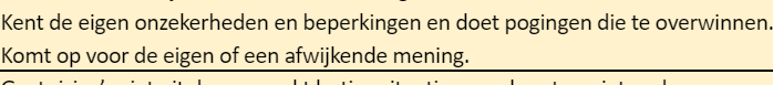 1 : Kent de eigen onzekerheden en beperkingen en doet pogingen die te overwinnen.